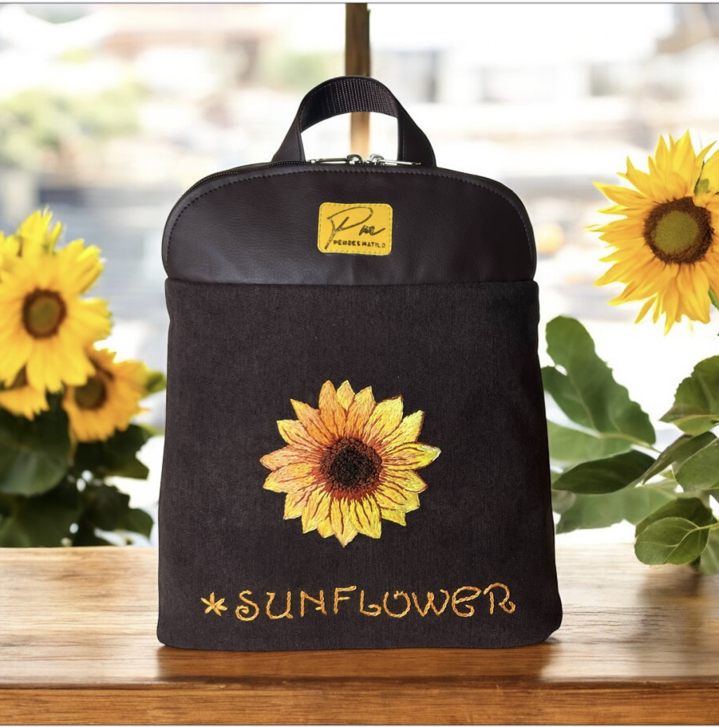 Hátitáska kézzel hímzett napraforgó mintával. A hímzés vastag vízlepergető és kopásálló bútorszövetre készült. A táska teste prémium minőségű textilbőr. Belül pamut bézs bélése van, és egy cipzáras és nyitott belső zsebet raktam bele. Belefér az A4-es méretű mappa. Minden termékemre fél év garanciát vállalok. Méretei: